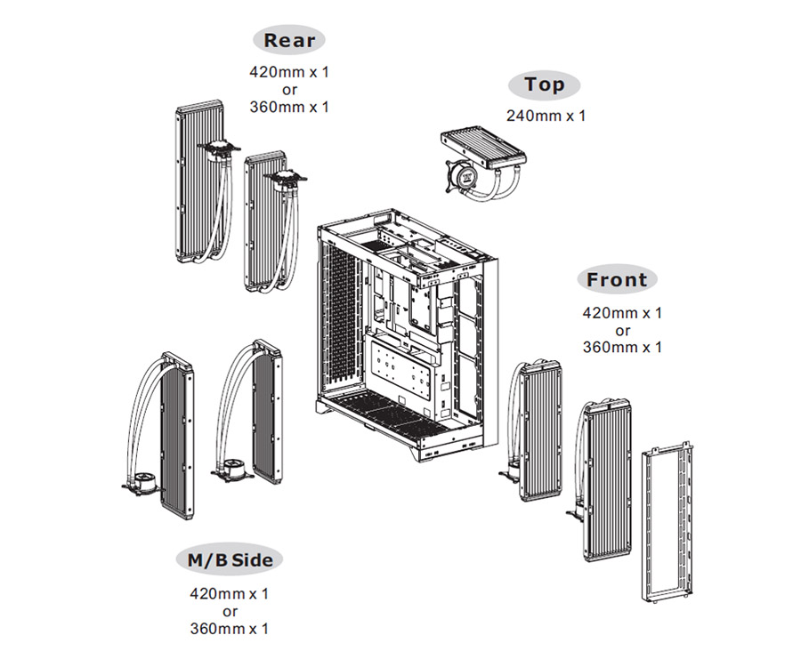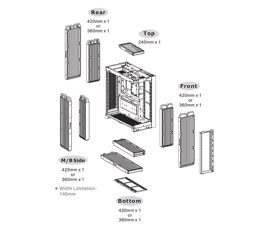 | SUPPORT RADIATEUR | Front: 1 x 360mm, 1 x 240mm, 1 x 120mm 1 x 420mm, 1 x 280mm, 1 x 140mm Top: 1 x 240mm, 1 x 120mm Right (M/B Side): 1 x 360mm, 1 x 240mm, 1 x 120mm 1 x 420mm, 1 x 280mm, 1 x 140mm Rear: 1 x 360mm, 1 x 240mm, 1 x 120mm 1 x 420mm, 1 x 280mm, 1 x 140mm Bottom (DIY only): 1 x 360mm, 1 x 240mm, 1 x 120mm 1 x 420mm, 1 x 280mm, 1 x 140mm |