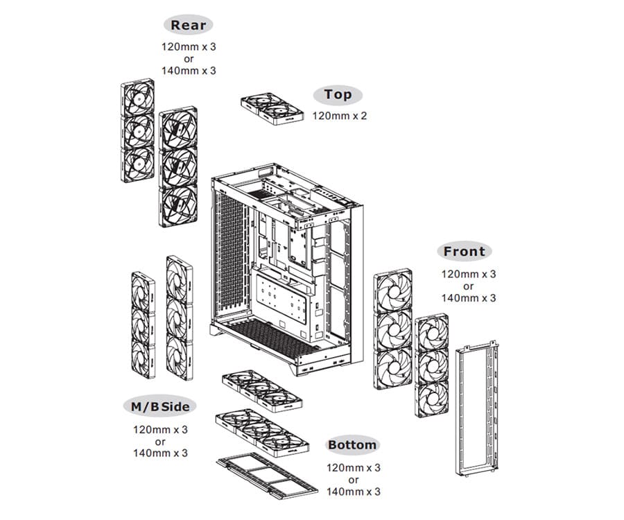 | SOUTIEN DES VENTILATEURS | Front: 3 x 120mm, 2 x 120mm, 1 x 120mm 3 x 140mm ,2x 140mm, 1 x 140mm Top: 2 x 120mm, 1 x 120mm Right (M/B Side): 3 x 120mm, 2 x 120mm, 1 x 120mm 3 x 140mm ,2x 140mm, 1 x 140mm Rear: 3 x 120mm, 2 x 120mm, 1 x 120mm 3 x 140mm ,2x 140mm, 1 x 140mm Bottom: 3 x 120mm, 2 x 120mm, 1 x 120mm 3 x 140mm ,2x 140mm, 1 x 140mm |